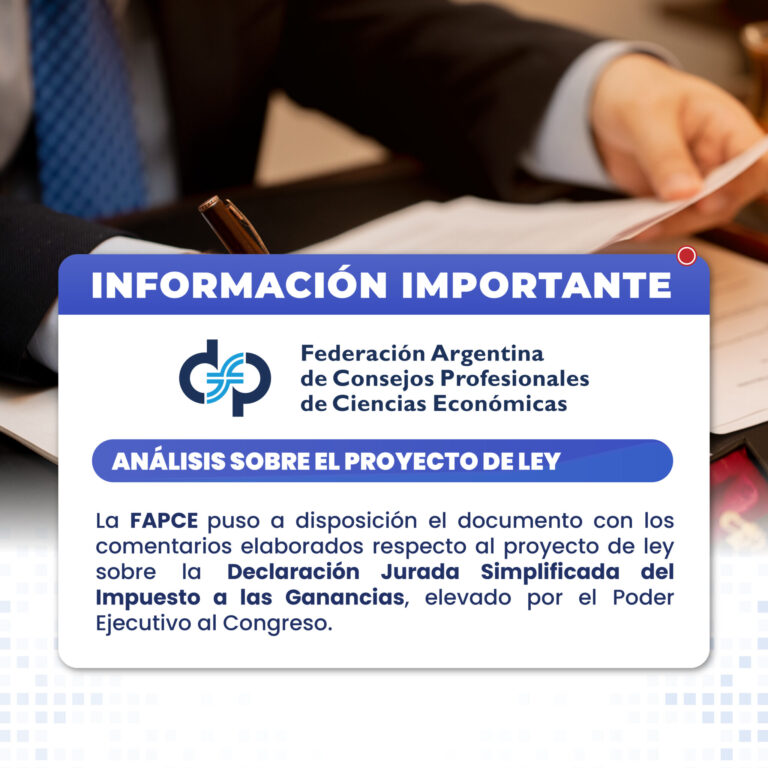 La Federación Argentina de Consejos Profesionales de Ciencias Económicas (FACPCE) puso a disposición el documento con los comentarios elaborados respecto al proyecto de ley sobre la Declaración Jurada Simplificada del Impuesto a las Ganancias, elevado por el Poder Ejecutivo al Congreso.