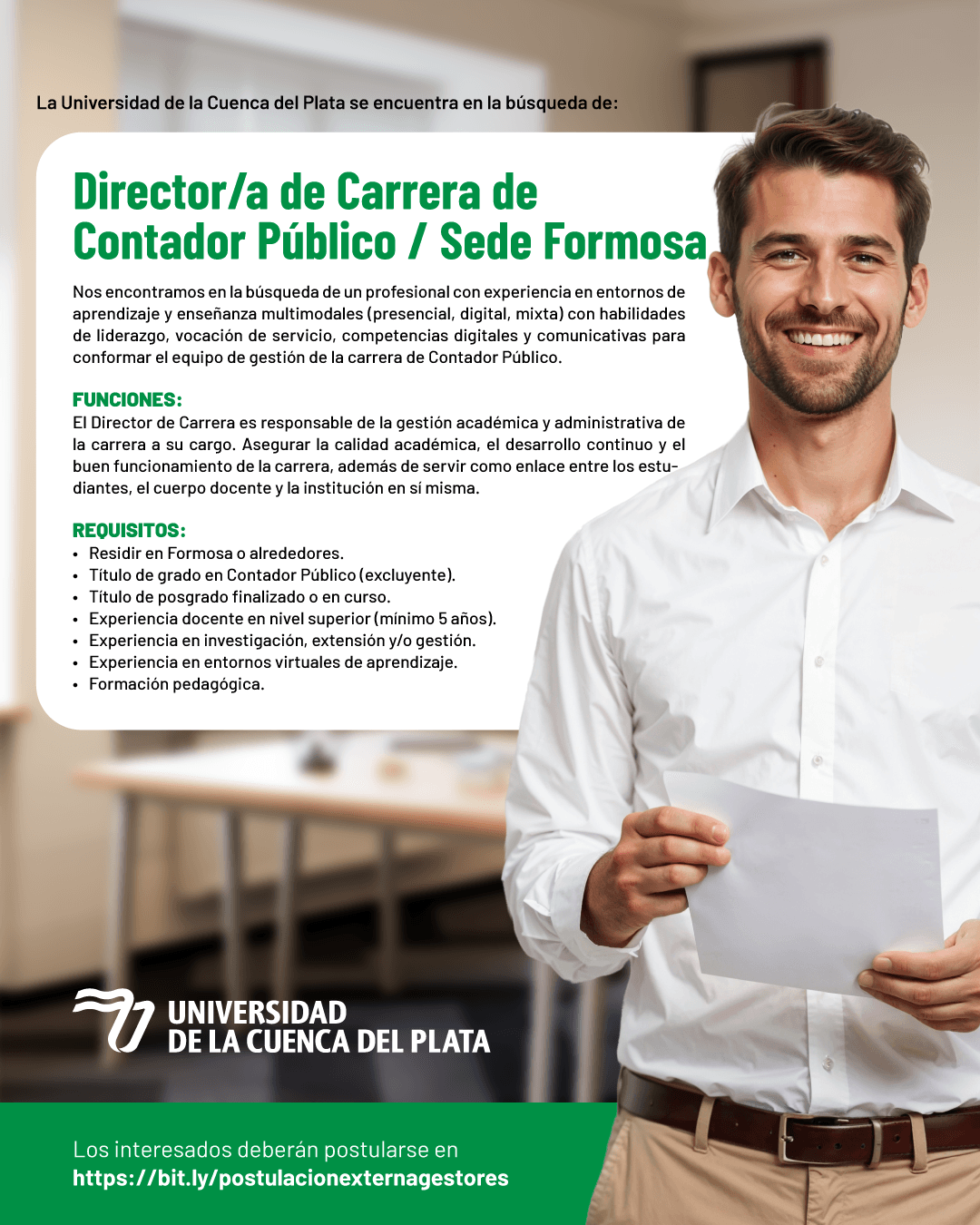 Los interesados que cumplan con el perfil solicitado deben completar su postulación de manera online a través del siguiente enlace, seleccionando la opción «Formosa – Director/a de Carrera de Contador Público»: