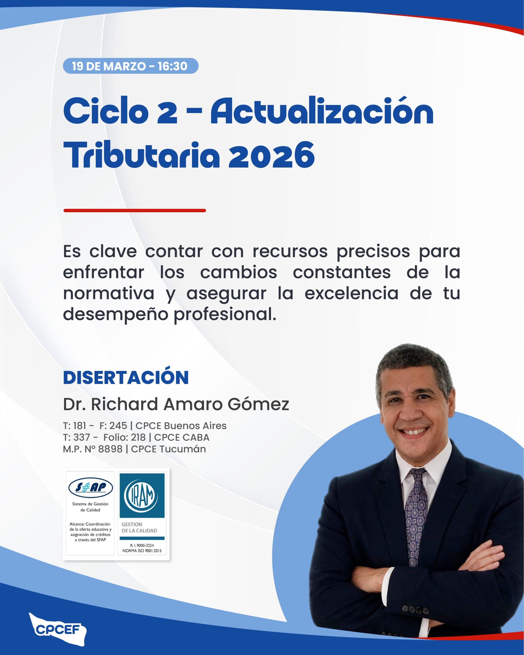 19/03/2026 - 16:30 a 18:30Ciclo 2 – Actualización Tributaria 2026 Capacitaciones Modalidad Virtual Disertación • Dr. Richard Amaro GómezInscripciones Inscribirse desde el autogestión DetallesMix de novedades