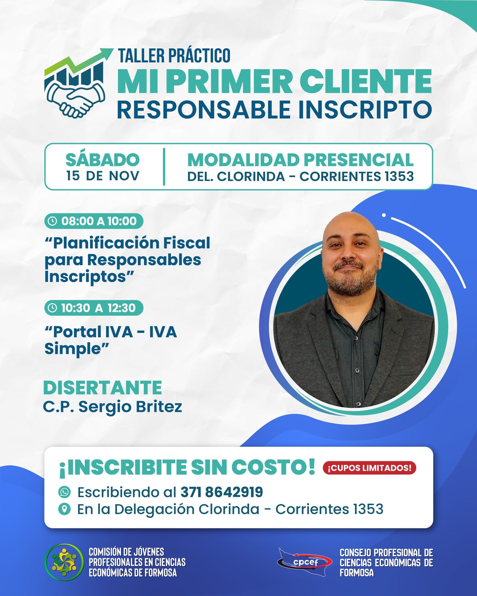 ¡Atención Clorinda! El CPCEF, junto a la Comisión de Jóvenes, te invita al taller presencial: MI PRIMER CLIENTE RESPONSABLE INSCRIPTO• 08:00 a 10:00: Planificación Fiscal • 10:30 a 12:30: Portal IVA - IVA Simple 📍 Lugar: Delegación Clorinda (Corrientes N°1353). ✍️ Inscribite SIN COSTO por WhatsApp al 371 8642919 o de forma presencial en la […] |