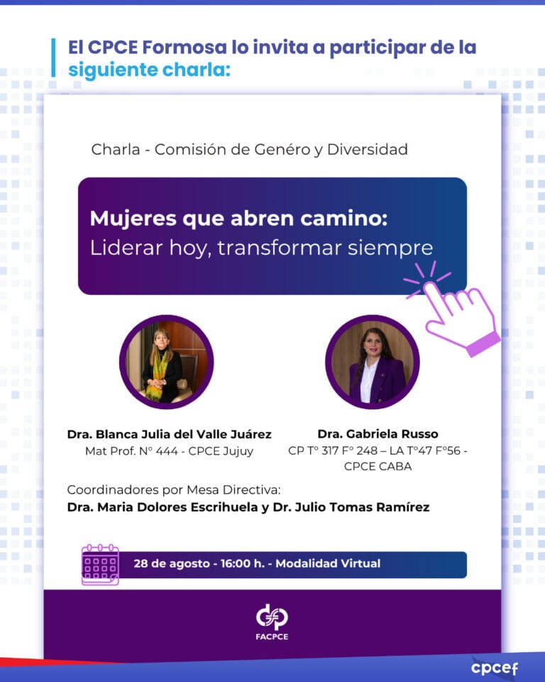 28/08/2025 - 16:00 a 18:00Mujeres que Abren Camino: Liderar Hoy, Transformar Siempre Capacitaciones, Invitaciones Virtual DISERTACIÓN • Dra. Blanca Julia del Valle Juárez• Dra. Gabriela RussoDETALLESCoordinadores por Mesa Directiva:Dra. Maria Dolores Escrihuela – MP 1647 – CPCE Misiones.Dr. Julio Tomas Ramírez – T. 1 Folio 223 – CPCE ChubutINSCRIPCIONES Añadir al calendario Google Calendar Outlook 365 Outlook Live