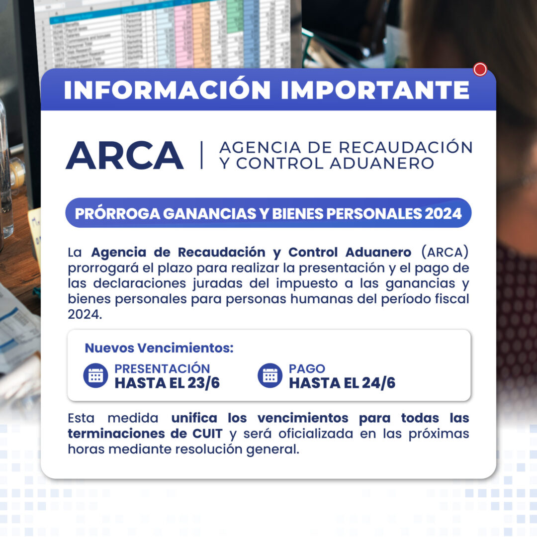La Agencia de Recaudación y Control Aduanero (ARCA) informó a través de su cuenta oficial en X que se extiende el plazo para la presentación y pago de las declaraciones juradas del Impuesto a las Ganancias y Bienes Personales para personas humanas correspondientes al período fiscal 2024.