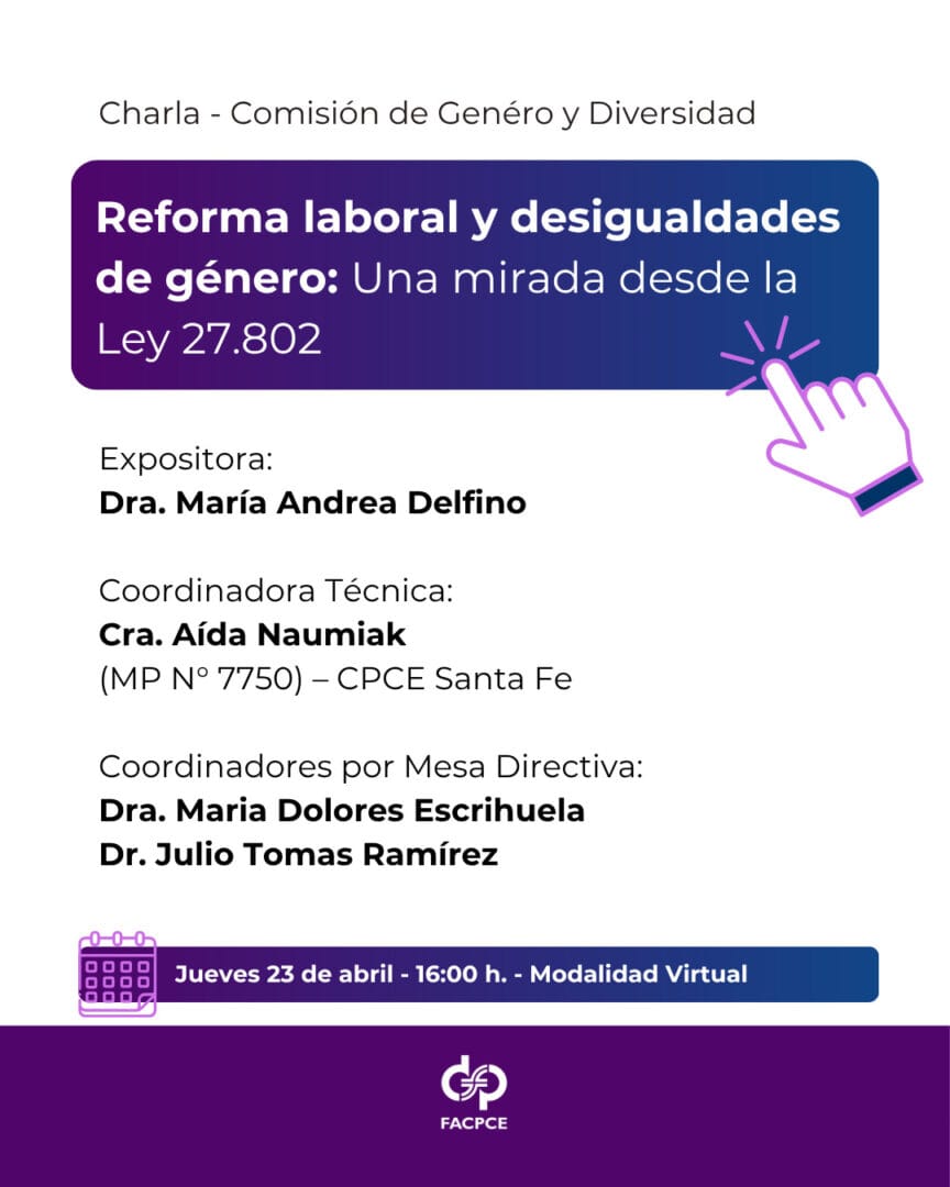 La Federación Argentina de Consejos Profesionales de Ciencias Económicas (FACPCE) abre un espacio de análisis fundamental para los profesionales del sector. El próximo jueves 25 de abril, de 16:00 a 17:00 horas, se llevará a cabo la charla virtual “Reforma Laboral y Desigualdades de Género: Una Mirada desde la Ley 27.802”.
