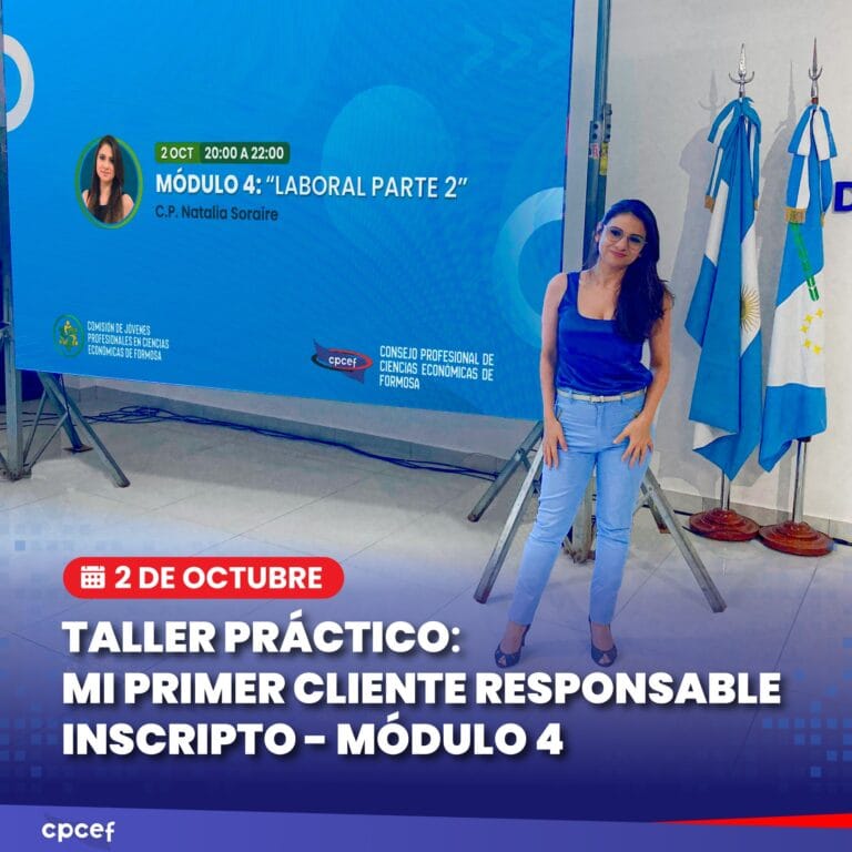 El pasado miércoles 2 de octubre se realizó el cierre del ciclo del Taller Práctico «Mi Primer Cliente Responsable Inscripto», organizado por la Comisión de Jóvenes Profesionales del Consejo Profesional de Ciencias Económicas de Formosa (CPCE Formosa). El taller, que constó de cuatro módulos, culminó con el Módulo 4: Laboral Parte 2, a cargo de la Cra. Natalia Soraire.
