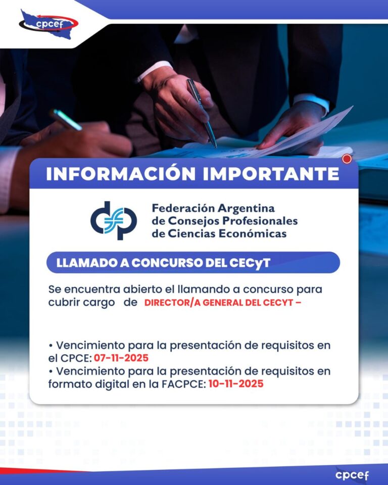 | Recepción de documentación: En los CPCE: hasta el 7/11/2025. La documentación en formato digital PDF deberá ser remitida a FACPCE hasta el 10/11/2025 |