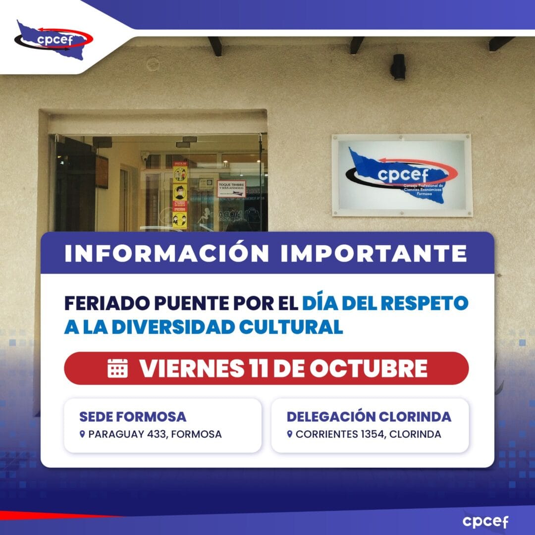 Informamos a nuestros matriculados que el viernes 11 de octubre, en el marco del feriado puente turístico previo al Día del Respeto a la Diversidad Cultural, el Consejo no brindará atención al público tanto en la Sede Formosa como en la Delegación Clorinda.
