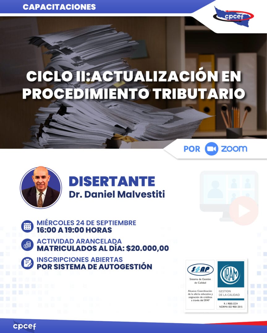 ACTIVIDAD ARANCELADA: Matriculados al día: $20.000,00 CONTENIDOS: Vías Recursivas – Defensas – Su seguimiento a través de las distintas instancias – La importancia del Tribunal Fiscal de la Nación – […]